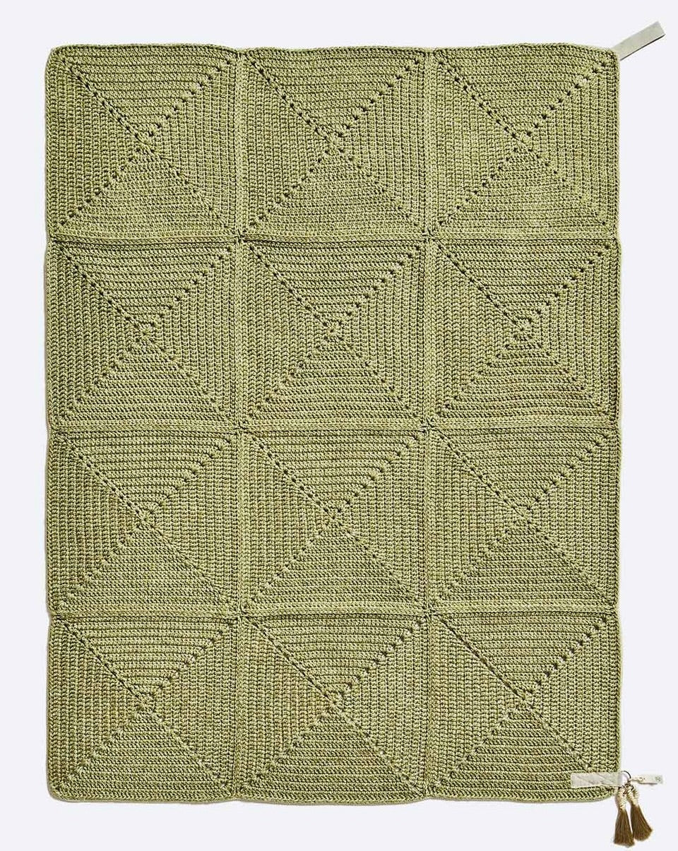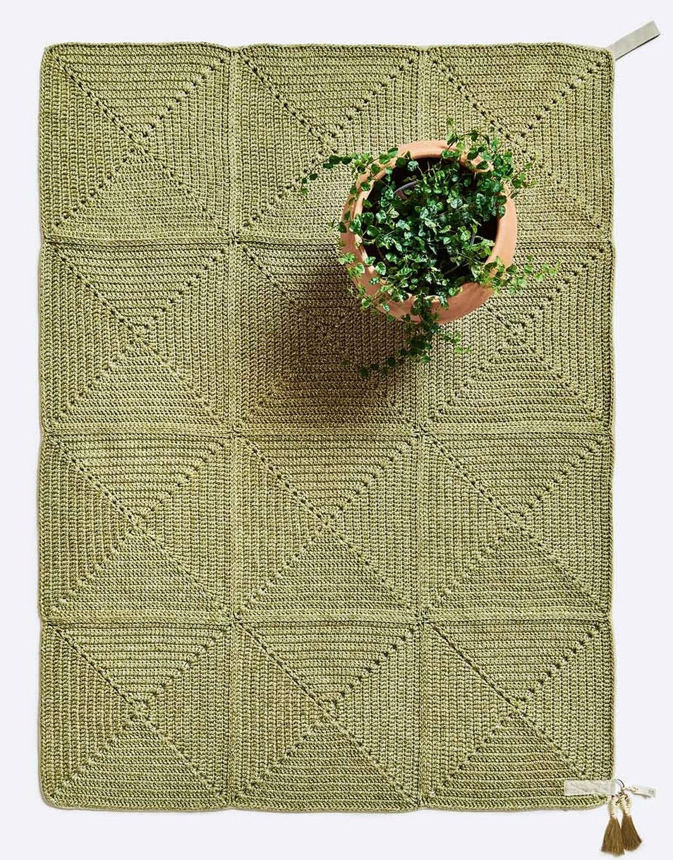 Den klassiske heklede bestemor-firkanten tar en moderne vri i dette utendørsteppet. Store firkanter danner teppet, innrammet med skreddersydd webbing. Håndlaget av UV-beskyttet skreddersydd iota-garn i jordfarger, tekstilet er mykt, men likevel slitesterkt og egnet for innvendige og utvendige rom. Denne kolleksjonen kombinerer tykk og kunstferdig hekling med smart skreddersøm på høyt nivå. I lavsesongen, oppbevar utemøblene dine på et kjølig, ventilert og tørt sted innendørs. Hvis møblene må stå utendørs, er det best at de står under tak og plasseres på et tørt underlag for å hindre vannskader nedenfra. Etter nedbør eller tøffe værforhold, sørg for å tørke av overflødig fuktighet eller vann fra alle flate overflater.